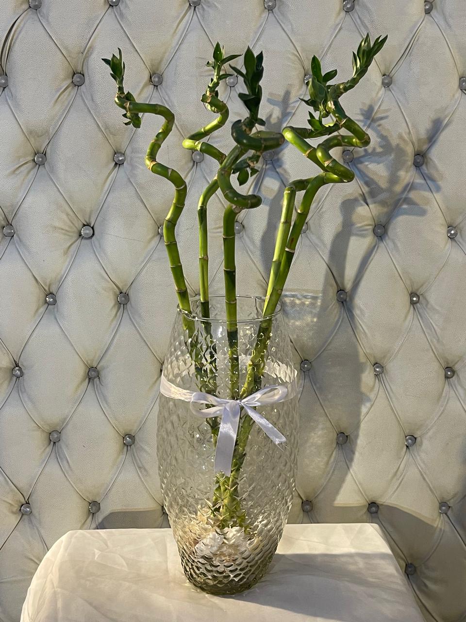 النبات: يتميز التنسيق بخمسة أعواد طويلة وكثيفة من نبات "البامبو" الطبيعي الفاخر بمقاس 90 سم، تنتهي بتشكيلات لولبية حلزونية متداخلة ببراعة، وتتوجها أوراق خضراء غنية تتجه للأعلى، مما يمنح القطعة مظهراً فخماً وممتلئاً يوحي بالنمو والازدهار.