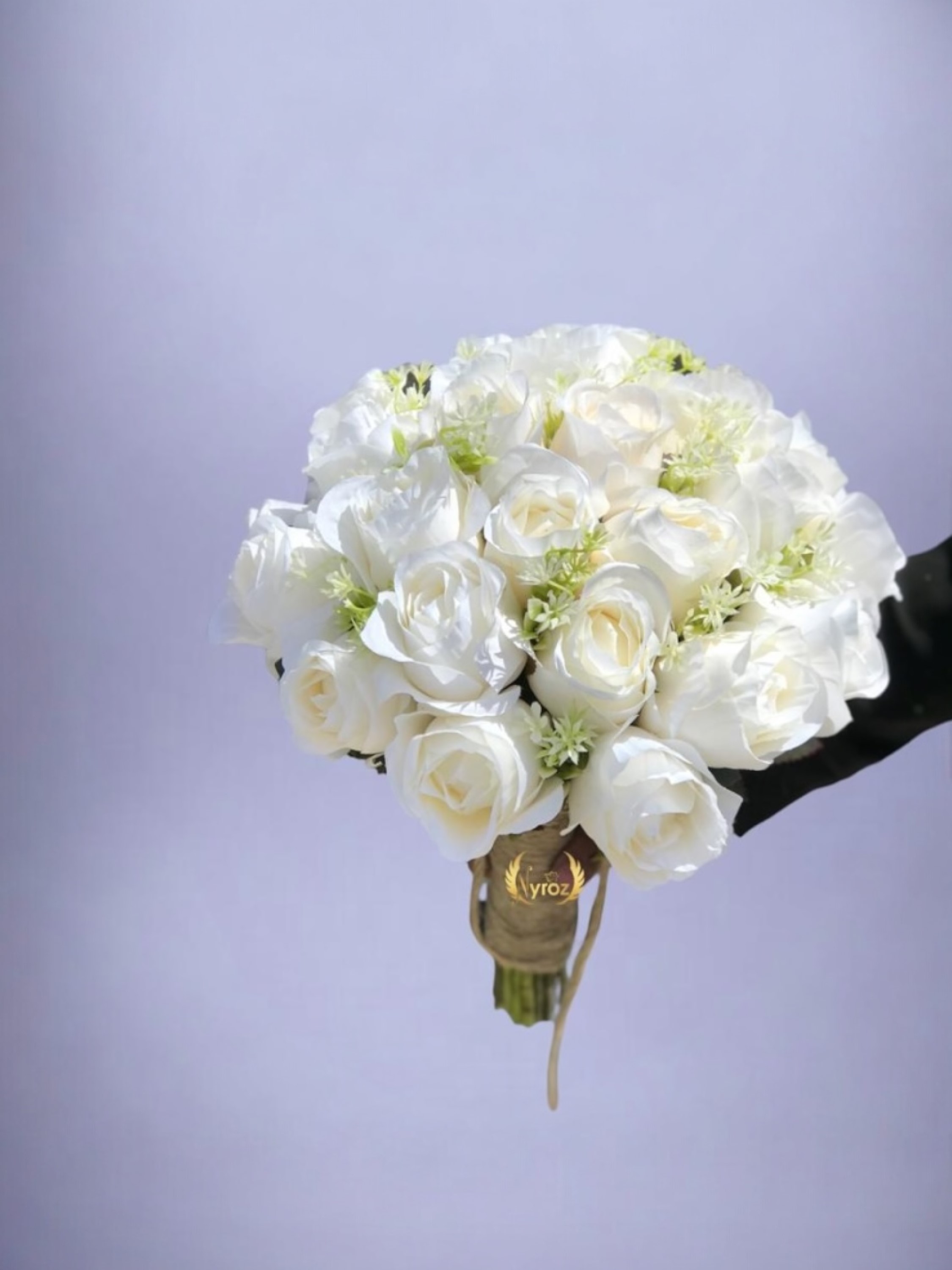 التصميم والقاعدة: الباقة منسقة بشكل طولي هرمي، مع وجود زهور الجبسوفيليا البيضاء الرقيقة عند القاعدة، والمقبض ملفوف بالكامل بخيوط الخيش الطبيعية لتكتمل اللمسة الريفية.
