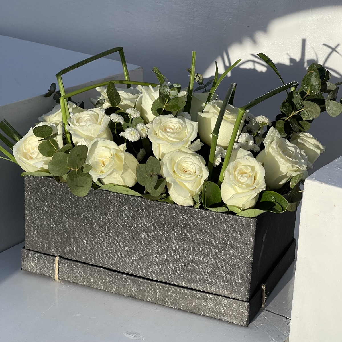 الورد مثبت على إسفنجة مبللة تشغل كامل مساحة البوكس. يُرجى صب ربع كوب من الماء العذب ببطء شديد في وسط الباقة (بين الورود البيضاء) كل يومين لضمان بقاء الإسفنجة رطبة من الداخل.