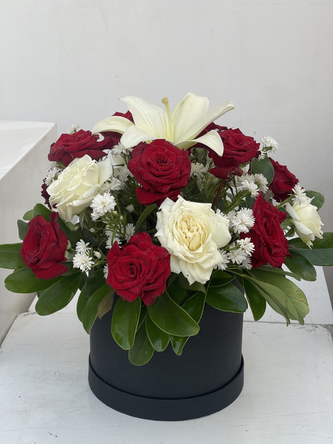 المكونات الزهرية: يتميز التنسيق بقلب من الورد الأبيض الناصع الذي يتوسط المربع، محاطاً بإطار كثيف من الورد الأحمر الداكن، مما يمنح التنسيق عمقاً وشكلاً منظماً وجذاباً.